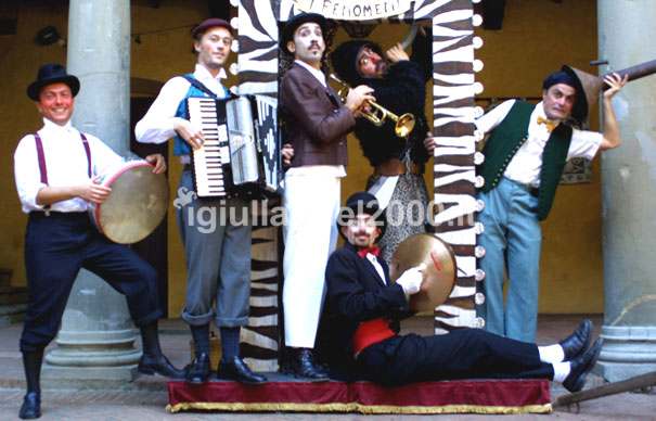 Mini Band I Giullari: Giullari-Musicisti itineranti in meravigliosi costumi, coinvolgono bambini e adulti in sfilate e balli scatenati. I loro fantasiosi e acrobatici percorsi musicali che spazziano dai successi latino-americani, al repertorio più allegro della musica classico-napoletana, allo swing anni 50, alla grande lirica, creano un’allegria nell’aria assolutamente contagiosa e unica.